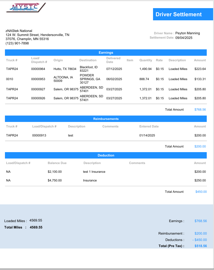 Creating professional driver settlement sheets is simple with MYSTC. Choose from three customizable PDF templates, each capable of displaying any data you’ve entered. You can also add your company branding for a polished, personalized touch. With just one click, generate a complete breakdown of driver settlements—including earnings, advances, per diems, reimbursements, deductions, loans, and more—clearly organized for your convenience.