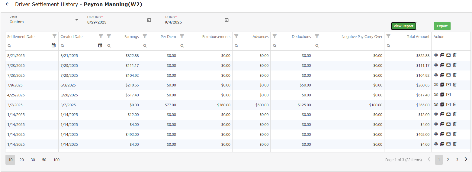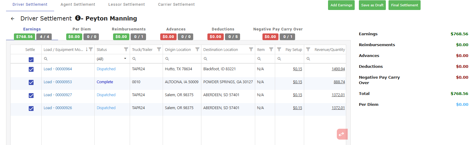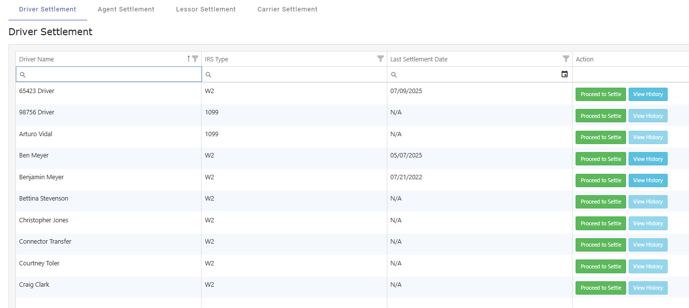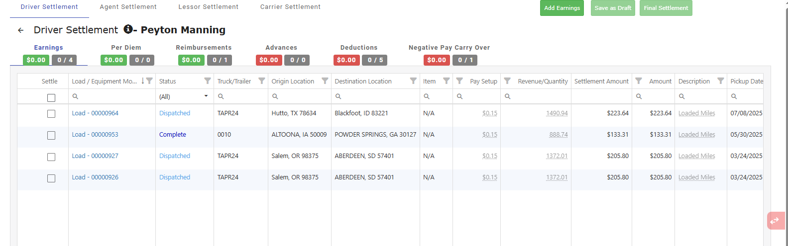 Set up recurring deductions, loans, escrow payments, per diems, or reimbursements based on submitted receipts with ease. All relevant details—driver pay, advances, deductions, fuel charges, and more—are conveniently displayed on the driver settlement screen. Need to make a change? Additions or adjustments can be made quickly right within the settlement interface.